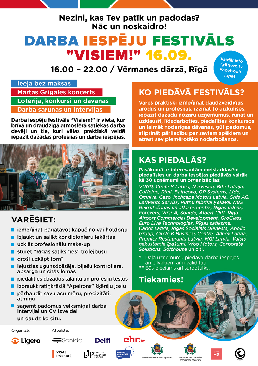 Pasākumā ar interesantām un praktiskām meistarklasēm piedalīsies un darba iespējas piedāvās vairāk kā 30 uzņēmumi un organizācijas – VUGD, Circle K Latvia, Narvesen, Bite Latvija, Caffeine, Rimi, Balticovo, GP Systems, Lido, Omniva, Gaso, Inchcape Motors Latvia, Grifs AG, Lafivents Serviss, Putnu fabrika Ķekava, NBS Rekrutēšanas un atlases centrs, Rīgas ūdens, Forevers, Virši-A, Sonido, Albert Cliff, Riga Airport Commercial Development, GroGlass, Euro Live Technologies, Rīgas satiksme, Cabot Latvia, Rīgas Sociālais Dienests, APL Latvia, Circle K Business Centre, Allnex Latvia, Premier Restaurants Latvia, MGI Latvia, Valsts nekustamie īpašumi, Woo Motors, Corporate Solutions, Softhouse un citi.