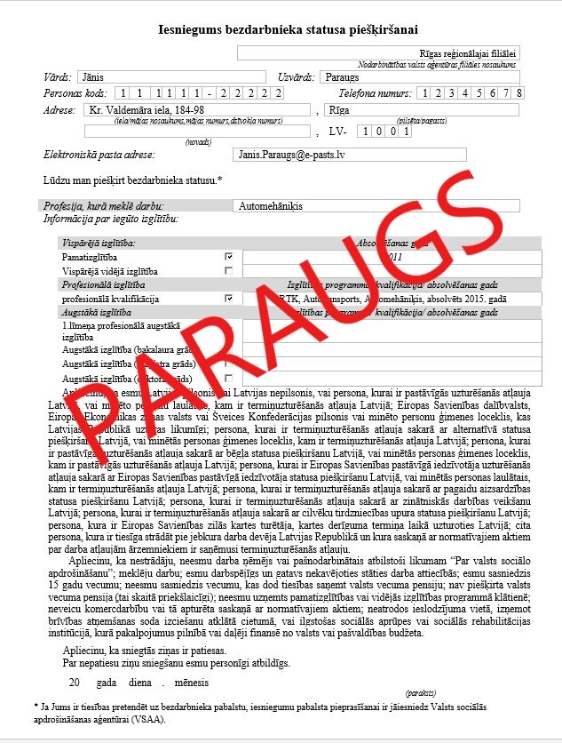 - 5.solis – Lejupielādējiet un aizpildiet iesniegumu bezdarbnieka statusa piešķiršanai (paraksts nav vajadzīgs);IESNIEGUMS bezdarbnieka statusa piešķiršanai